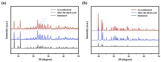PXRD diagrams of compounds 1 (a) and 3 (b) before and after three cycle experiments.