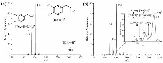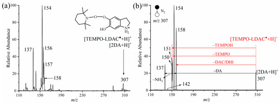 To confirm the structures of the protonated DASQ and LDAC radical cations 8 and 9 (Figure 1b), TEMPO reagent was used to capture the radicals during the enzymatic oxidation of DA. In this experiment, 2.5 mM TEMPO was present in the solution containing 2.5 mM DA and 100 U of enzyme solution. Figure 3a shows the APGD-MS spectrum of the reaction: the peaks at m/z 156, m/z 157, and m/z 158 were assigned to the ammonium oxide ion of TEMPO, the oxoammonium salt, and the corresponding hydroxylamine (TEMPOH), respectively [27,28]. The peak at m/z 307 was assigned to a mixture of [TEMPO-LDAC● + H]+ adduct and [2DA + H]+, which were further characterised by tandem mass spectrometry (Figure 3b).