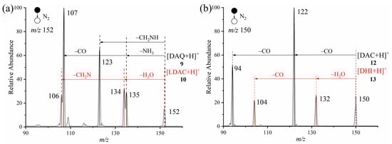 MS2 spectra of the ions (a) at m/z 152 and (b) m/z 150 in DA-PPO solution. The CID energy was 15 eV.