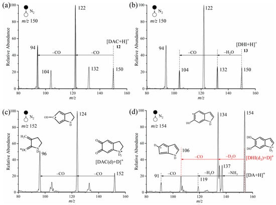 Spectra obtained from (a) APGD-MS of DA with D2O. MS2 spectra were obtained of (b) DAC and DHI in DA-enzyme solution; (c) DAC and (d) DHI in deuterated DA-enzyme solution. The CID energy was 15 eV, 15 eV, 20 eV and 15 eV for (a), (b), (c) and (d), respectively.