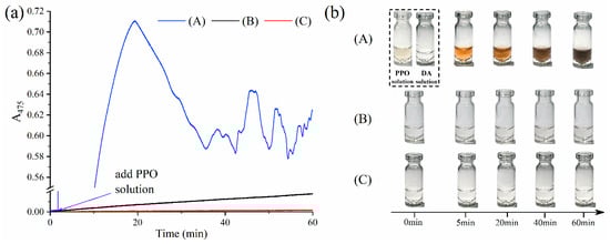 (a) A graph that is a curve of absorbance changes for a wavelength of 475 nm over time, (b) colour pictures of (A) DA-PPO solution, (B) DA-phosphate buffer solution and (C) DA pristine solution within 60 min.