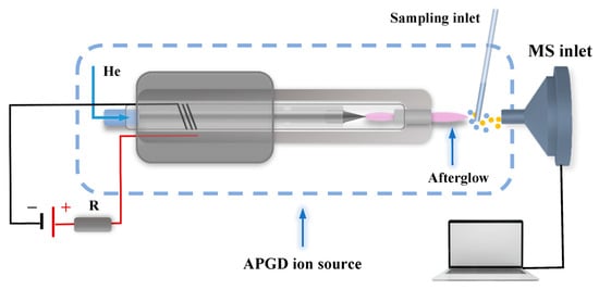 Ambient ionisation MS (AIMS) enables the direct and rapid surface analysis of short-lived species of different reactions [18,19]; one such approach that shows promise is atmospheric pressure glow discharge MS (APGD-MS) since it offers possibilities for direct and effective analysis of compounds without time-consuming pretreatment, auxiliary sampling, or desorption operations. Alves et al. reported an ion source for liquid sampling–atmospheric pressure glow discharge (LS-APGD) to produce ion intensities equal to or higher (>15%) than that of electrospray ionisation for marine-relevant salt-containing organic samples [20]. Fandino et al. evaluated a modified halo-shaped flowing atmospheric pressure afterglow (h-FAPA) source for direct analysis of benzene in volatile organic compounds with low matrix effects [21] and Zhang et al. designed a reactive-FAPA ionisation source for rapid isomer differentiation by real-time derivatisation of analytes [22]; moreover, Guć et al. analysed perfume components in cosmetics using FAPA-MS by directly determining the fragrance components: patchoulol, farnesol, safrole, geraniol, eucalyptol, and R-carvone [23]. These applications implied that the introduction of afterglow into APGD could not only extend the direct analysis of various types of samples [24], but also provide some possibilities for the identification of short-lived intermediates, even in complicated systems.