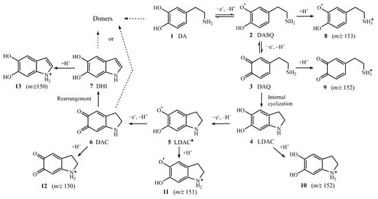 Dopamine (DA) is a neurotransmitter that serves as a fundamental signalling chemical transmitter in intercellular communication [1,2]. Oxidation of DA is thought to be related to the aetiology of neurological diseases [3]. The detection of DA has become an important basis for the clinical diagnosis of many neurodegenerative diseases. Hence, it is critical to apply sensitive and accurate methods to characterise and understand the oxidative pathways and metabolites of DA. Many methods, including NMR [4], EPR [5], mass spectrometric [6,7] and spectroscopic techniques [8,9], have been applied to study the DA oxidation pathway. However, DA is highly active and easily undergoes autoxidation, metal oxidation, or enzymatic oxidation in the cytoplasm [10,11,12]. There are still many possibilities for the development of new techniques and applications for effective analysis of DA and its oxidation processes.