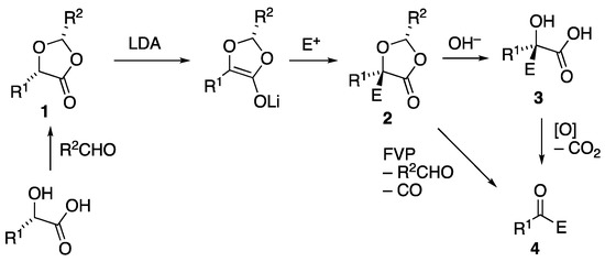 Starting from the seminal work of Seebach almost 40 years ago [1], chiral 1,3-dioxolan-4-ones 1 have proved very useful in asymmetric synthesis. As shown (Scheme 1), they are readily formed from α-hydroxy acids, such as lactic (R1 = Me) and mandelic acid (R1 = Ph), that are available in enantiomerically pure form and are readily purified to give pure diastereomers in which a second stereogenic centre has been introduced under control from the first. This is fortunate, since, although deprotonation results in loss of the stereochemical information at C–5, this is “stored” by the C–2 centre, and subsequent reaction with an electrophile takes place with high selectivity to give products 2.