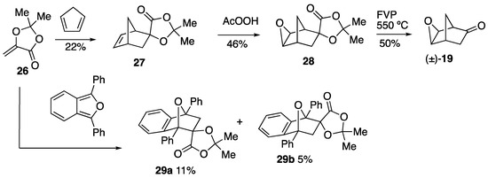 With a view to obtain racemic samples of some of the pyrolysis products for reference, we also examined Diels–Alder cycloaddition of 2,2-dimethyl-5-methylene-1,3-dioxolan-4-one 26. Although this compound has been prepared in several ways [29,30], we were able to obtain it best by condensation of lactic acid and acetone followed by NBS bromination and treatment with triethylamine [18]. The Diels–Alder adduct with cyclopentadiene 27 [31] was readily formed, although in low yield, and was difficult to purify owing to partial cycloreversion to the starting components upon distillation or column chromatography. Despite this, satisfactory spectroscopic data were obtained and peroxyacetic acid oxidation afforded the epoxide 28. In this the alkene signals of 27 (δ 6.17, 6.48 ppm in 1H NMR and 133.0, 140.3 ppm in 13C NMR) had been replaced by new signals for CH–O at δ 3.30, 3.44 ppm in 1H NMR and 47.9, 50.9 ppm in 13C NMR. When this was subjected to FVP at 550 °C, the expected fragmentation took place with loss of acetone and carbon monoxide to give the racemic epoxyketone 19 spectroscopically identical to the chiral material obtained earlier from 16 (Scheme 9).