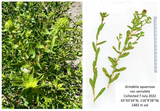 The genus Grindelia Willd. (Asteraceae) is made up of around 73 species [1], naturally ranging in western and central North America, Mexico, and South America, but introduced to eastern North America and the Old World [2]. Grindelia squarrosa (Pursh) Dunal (Asteraceae), curlycup gumweed, is a short-lived herb or subshrub, with oblong to oblanceolate, crenulate-serrulate leaves (1.5–7 cm long and 0.5–1.3 cm wide), and ranges throughout the Great Plains, Rocky Mountains, and Great Basin areas of North America. The plant has been introduced elsewhere [3,4], and has become an invasive species in central Europe [5]. Several varieties of G. squarrosa have been described [6], and three have been recorded in Idaho, namely G. squarrosa var. quasiperennis Lunell, G. squarrosa var. serrulata Steyerm., and G. squarrosa var. squarrosa Cronquist [7].