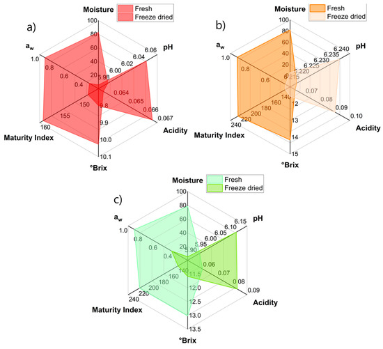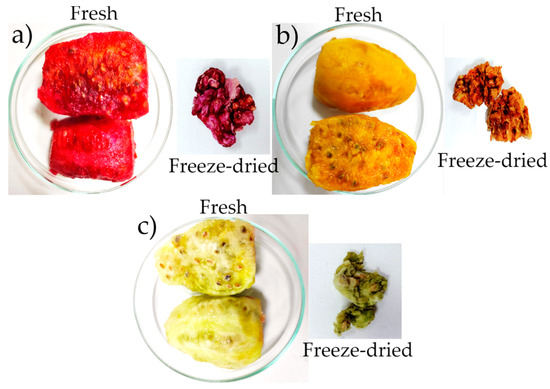 Variations in the physicochemical characteristics of fresh and freeze-dried prickly pear fruit: (a) morada, (b) anaranjada, (c) blanca.