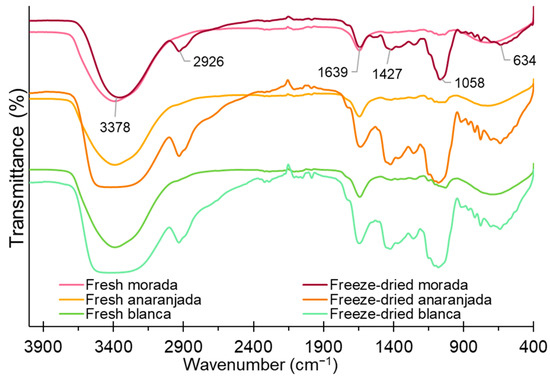 FTIR analysis allows the identification of functional groups of constituents in foods and is a quick measurement tool to identify certain compounds. Figure 3 shows a peak around 3378 cm−1, which corresponds to the strong stretching of the -OH and -NH groups and would be attributed to the presence of water, phenolic compounds, carbohydrates, vitamin C, and polypeptides [58,59], whose peaks present greater intensity in freeze-dried fruits; this is evidenced by the increase in bioactive compounds (TPC, AA, AA) shown in Table 3. Freeze-dried prickly pear fruits present a peak around 2926 cm−1, and this is due to the asymmetric stretching of the CH and NH3 groups due to the presence of amino acids and carboxylic acids. However, fresh fruits do not present such a peak given their high water content, which would considerably reduce their concentrations [41,60,61].