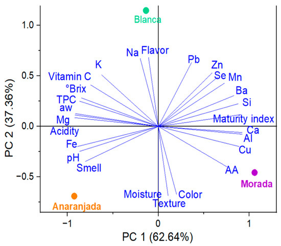 The PCA results showed scattered trends of the parameters for the freeze-dried fruits studied. The blanca ecotype had higher Na, Zn, and Se content and better flavor (Figure 4). Regarding the morada ecotype, it stood out in Ca, Cu, Al, Si, and Ba content, with better color and texture attributes. The anaranjada fruit presented higher K, Mg, Fe, TPC, and vitamin C content, with high water activity, more soluble solids, and better pH, acidity, and odor.