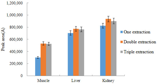 | Chicken muscle | y = 564.28x + 37,020 | 0.9990 | 4.9–3200 | 2.2 | 4.9 | 1032.0 | 1034.1 |