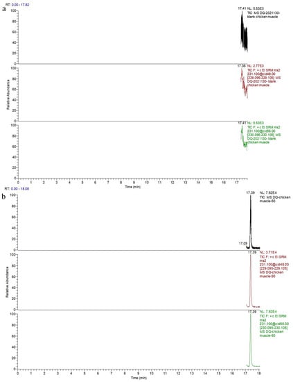 | Chicken muscle [36] | LC-MS/MS | XTerra MS (C18: 2.1 × 100.0 mm, 3.5 μm) Mobile phase: A: 0.1% formic acid aqueous solution; B: acetonitrile | 1.0 | 2.5 | 85.3~104.9 |