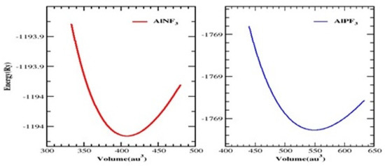 The unit cell of AlRF3 (R = N and P) crystals with space group Pm3m (# 221) had a cubic perovskite structure with a single molecule. The F atoms appeared at (½, ½, ½); the R atoms (R = N, P) at (0, ½, ½), (½, 0, ½) and (½, ½, 0); and the Al atoms at (0, 0, 0), respectively. Figure 1 depicts the arrangement of Al-based fluoro-perovskites cubic crystals. We calculated the total energy of the cell against volume to be around V0 (the volume of the building block in stable conditions). Utilizing Birch–Murnaghan’s equation of state [25], the volume optimization technique was used to obtain structural properties. We performed analytical calculations of our acquired locations using Birch–Murnaghan’s equation of state to fit the obtained information and achieve the lowest energy state features, such as an equilibrium lattice length ao, a bulk modulus B and its pressure derivative B’. As illustrated in Figure 2, the bottommost energy unit cell could be obtained by reducing the total energy for the appropriate volume of the unit block. The lowest state energy Eo was defined as the total minimum energy against volume. The volume was referred to as Vo, which stands for the optimal least volume. The compounds constructed with the peak optimal energy were expected to be more stable. The ideal structural parameters which we calculated are included in Table 1, including ao (optimized lattice constant), Eo (optimized lowest energy state), B (bulk modulus), Vo (optimized volume) and B’ (bulk modulus pressure derivative). Since the bulk modulus dropped with an increasing lattice constant, these consequences were consistent with the general trend of this approximation, implying that the estimated conclusions are very precise and genuine.