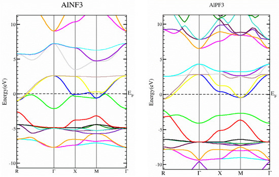 The band structures of AlRF3 (R = N, P) compounds, achieved using the Tb-Mbj technique.