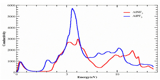For both substances, photon conductivity began at 0 eV. Other peaks for AlPF3 were 1000, 0, 2200, 5800 and 2800 at 0.4, 2.0, 3.2, 5.9 and 10.3 eV, respectively. Figure 8 depicts the peaks for AlNF3 as 1000, 0, 3000, 3100, 1900 and 2000 at 0.4, 2.0, 5.0, 6.3, 9.9 and 11.5 eV, respectively. As a consequence, it was discovered that the AlPF3 crystal is optically more conductive at low energy than AlNF3.