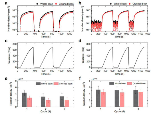 Considering that the surface area of the crushed bean is considerably larger than that of the whole bean, the chemical species should be more adsorbed on the crushed bean. Herein, increased adsorption of the reactive species on the crushed beans was clearly demonstrated, since the number densities of O3 and NO2 were lower in the crushed beans than in the whole beans (Figure 1a,b). Moreover, the time-averaged number density of O3 with both types of soybeans decreased during the second pressurization cycle, thereby indicating that O3 treatment makes the raw bean more reactive to O3 (Figure 1e). In the NOx mode (Figure 1f), the time-averaged number density of NO2 molecules remained almost constant, regardless of the number of cycles.