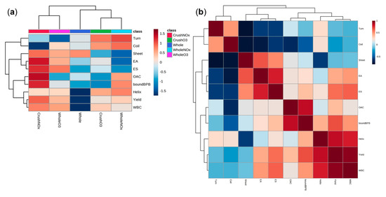 (a) Normalized response heatmap and (b) Pearson’s correlation coefficient (r) matrices of structural and functional properties of soybean proteins treated with atmospheric pressure plasma. The level of individual parameters corresponds to the color scale. A color gradient from blue to red represents a low to high level of the normalized response. Blue and red colors indicate negative and positive correlations between individual parameters, respectively. Abbreviations: Turn, β−turn; Coil, random coil; Sheet, β−sheet; EA, emulsifying activity; ES, emulsion stability; OAC, oil absorption capacity; WBC, water binding capacity; Helix, α−helix.