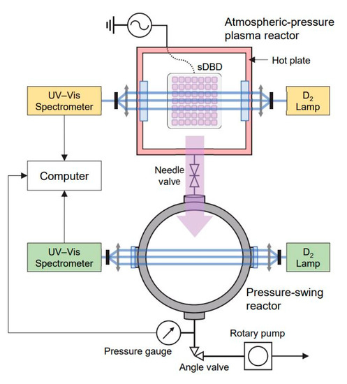 Figure 4 shows a schematic representation of our experimental apparatus, which consisted of a plasma reactor, a PS reactor, two identical absorption spectroscopic systems, and a power system. The details of our plasma reactor have been described previously [29,30]. A stainless steel chamber with an inner volume of 815 cm3 was used as the plasma reactor to produce surface dielectric barrier discharge (sDBD). The sDBD source was made of 70 mm × 70 mm thin-film electrodes attached to each side of a 1 mm thick, 100 mm × 100 mm fused silica plate. The electrodes had two different forms: a plane high-voltage electrode and a perforated ground electrode. The latter surface was opened with 49 patterns of 7 mm × 7 mm rounded squares in a 7 × 7 alignment, thereby forming surface discharges at the open edge of the electrode (Figure 4). A high-voltage amplifier (20/20C; Trek Inc., Medina, NY, USA) combined with a waveform generator (33512 B; Keysight, Santa Rosa, CA, USA) was used to operate the sDBD source with a 6 kVpp amplitude of the voltage waveform at a frequency of 2 kHz for the O3 mode or 4 kHz for the NOx mode. A hot plate (MSH-20D; Daihan Scientific, Wonju, South Korea) below the plasma reactor was set at 150 °C to maintain the reactor temperature. As the sDBD source formed the lid of the plasma reactor, reactive plasma species were produced inside the reactor.