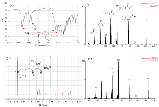 - Dinotefuran; LC-ESI-QFT.; MS2; CE: 15; R=35000; [M+H]+. MassBank: Swiss Federal Institute of Aquatic Science and Technology. 2015. Available online: https://massbank.eu/MassBank/RecordDisplay?id=MSBNK-Eawag_Additional_Specs-ET220203 (accessed on 1 April 2023).