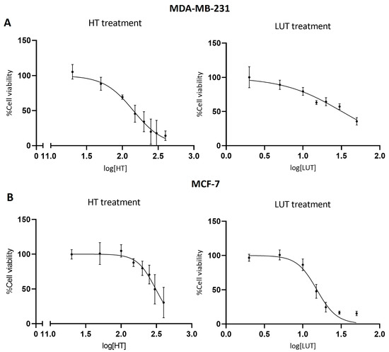 Viability of breast cancer cells upon 72 h treatment with different concentrations of HT or LUT, as assessed with an MTT assay. (A) Viability of MDA-MB-231 cells treated with HT (left) or LUT (right). (B) Viability of MCF-7 cells treated with HT (left) or LUT (right).