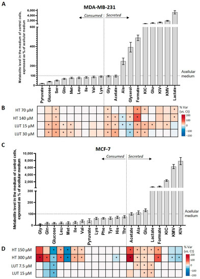 Metabolic profiling of culture medium. (A) Metabolites consumed and secreted by untreated MDA-MB-231 cells during 72 h in culture; the variations are expressed in relation to metabolite levels in an acellular medium (set to 100%, dashed line). (B) Heatmap coloured according to the % of the variation in MDA-MB-231 cells treated with HT (70 µM and 140 µM) or LUT (15 µM and 30 µM) in relation to untreated controls. (C) Metabolites consumed and secreted by untreated MCF-7 cells during 72 h in culture; the variations are expressed in relation to metabolite levels in an acellular medium (set to 100%, dashed line). (D) Heatmap coloured according to the % of the variation in MCF-7 cells treated with HT (150 µM and 300 µM) and LUT (7.5 µM and 15 µM) in relation to untreated controls. For metabolites consumed, the red colour represents higher levels in the medium, hence, lower consumption, while the blue colour represents lower levels in the medium, hence, increased consumption. For metabolites secreted, red and blue colours represent, respectively, higher and lower secretions. The colour intensity reflects the magnitude of consumption/excretion. Statistical significance was assessed with respect to controls using the t-test (* p < 0.05).