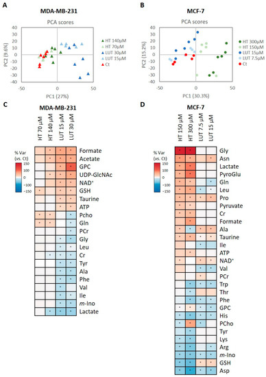 Metabolic profiling of cell polar extracts. (A,B) Score scatter plots obtained with a principal component analysis (PCA) of the spectral profiles obtained for MDA-MB-231 and MCF-7 cells, respectively. (C,D) Heatmaps of the metabolic variations induced by HT and LUT on intracellular metabolite levels of MDA-MB-231 and MCF-7 cells, respectively. The colour scale represents the % of the variation in relation to control cells (positive variations—red scale—for increased metabolites, and negative variations—blue scale—for decreased metabolites). Statistical significance was assessed with respect to controls using the t-test (* p < 0.05). Three-letter codes used for amino acids; ATP, adenosine triphosphate; Cho, choline; Cr, creatine; GPC, glycerophosphocholine; GSH, reduced glutathione; m-Ino, myo-inositol; NAD+, nicotinamide adenine dinucleotide; PCho, phosphocholine; PCr, phosphocreatine; UDP-GlcNAc, uridine diphosphate N-acetylglucosamine.