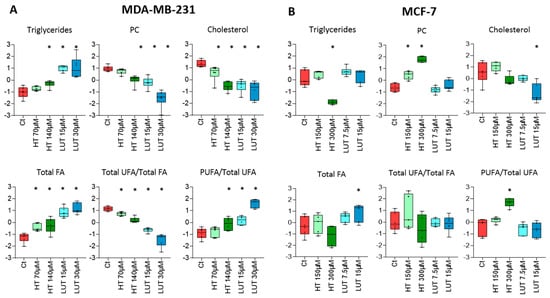 Regarding the variations in treated vs. control cells, in MDA-MB-231 cells (Figure 5A), HT and LUT caused an increase in TAG and total FA, accompanied with decreases in PC and cholesterol. These changes were more prominent for LUT than for HT. Regarding the FA composition of these lipids, total UFAs decreased in treated cells, but the relative contribution of PUFAs to the pool of unsaturated FAs increased. In MCF-7 cells (Figure 5B), HT treatment induced a decrease in TAG and an increase in PC, together with an increase in the PUFA/UFA ratio, whereas LUT did not change these lipids. On the other hand, only LUT decreased cholesterol levels.