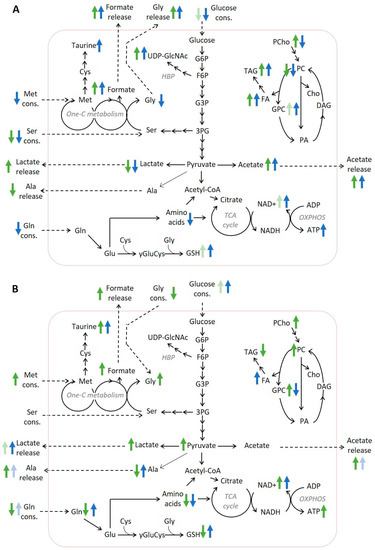 Schematic diagram showing the main metabolic responses of (A) MDA-MB-231 and (B) MCF-7 cells to HT (green arrows) and LUT (blue arrows) at the respective IC50 concentrations. Changes that did not reach statistical significance in relation to controls (p > 0.05) are represented with lighter arrows.