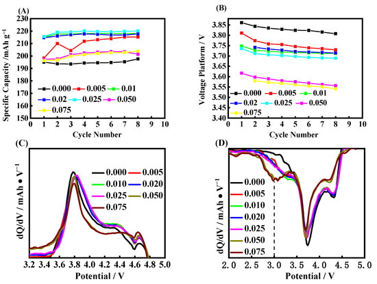 The dQ/dV curves of the eighth circle for each group are shown in Figure 2C,D. All of them have a current charge after 4.4 V, even if it is at the 8th circle, indicating that they have reversibility to a certain extent above 4.4 V, which has also been reported in the literature. The amount of coating has no obvious influence on the charging voltage peak and current. It is worth noting that there is a spinel discharge current around 2.75–3.0 V, which does not exist in the first cycle for the blank RLM-1, suggesting some phase transformations occur [29]. Comparatively, the spinel discharge current becomes obvious when the Nb2O5 is used, even if the coating ratio is only 0.005, which means that this coating can effectively accelerate the formation of the spinel phase, the amount of which is highly positively correlated with the ratios of the introduced Nb2O5. This may be due to the changed dynamic processes, which were related to the topotaxial factors, such as the migration channels of Li+, Mn, and O for the phase transformation of Li2MnO3 to spinel [30]. There are no obvious differences among all the samples for the coating ratio below 0.050. Moreover, the spinel current also shows little change compared with the first-cycle discharge, as shown in Figure 1J, when the coating ratio was at the range of 0.010–0.025, suggesting that the spinel nearly formed less at the following cycles. This explains the lower initial voltage and the slower voltage decay for the Nb2O5 coating material, and also agrees with the known mechanism of voltage decay for Li-rich material, namely, formed spinel. Notably, a larger response current below 3.6 V for the 0.050 and 0.075 coating ratios is observed, and this can be ascribed to the excessive spinel phase formed by the increasing amount of Nb2O5. Moreover, the huge decrease in the layered structural component was implicated in the excessive spinel phase forming, resulting in the smaller current in the range of 3.8–4.6 V. The obviously positive shift of the charging peaks indicates the larger polarization caused by the excessive Nb2O5 when the coating ratio is above 0.050.