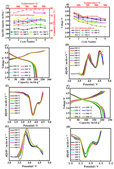 The cycling life curves (A), platform of discharge (B), charge and discharge curves and dQ/dV curves of the 1st cycle (C−E) and 8th cycle (F−H) of the samples obtained at 550 °C, 600 °C, 650 °C, 700 °C, 750 °C, 800 °C, 850 °C, and 900 °C, respectively.