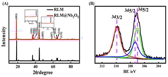XRD patterns (A) and Nb XPS pattern (B) of RLM@Nb2O5.