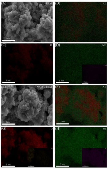 SEM images of RLM-1 (A), all-element mapping images of RLM-1 (B), O-element mapping images (C), Mn- and Ni-element mapping images (D), SEM images of RLM@Nb2O5 (E), all-element mapping images of RLM-1 (F), O- and Nb-element mapping images (G), Mn- and Ni-element mapping images (H).