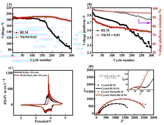 Figure 6A shows the improvement in the Nb2O5 coating for RLM-1. The blank RLM-1 shows a serious degradation at 170 cycles, and the capacity is 83.1 mAhg−1, only about 42.1% of the initial capacity at 300 cycles. Comparing with RLM-1, the RLM@Nb2O5 shows good cycling performance with a capacity retention of 81.5% at 300 cycles. This suggests that the proper coating proportion with Nb2O5 can effectively inhibit the capacity decay of a lithium-rich cathode. It is found that the voltage platform trend presents a similar behavior, which reveals a fast decay at 170 cycles for blank RLM-1 while retaining a good stability for RLM@Nb2O5, as shown in Figure 6B. The voltage platform retention is calculated by the Formula (1):