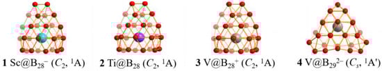 Optimized structures of the transition metal-doped seashell-like endohedral metallo-borospherenes C2 Sc@B28−(1), C2 Ti@B28 (2), C2 V@B28+ (3), and Cs V@B292− (4) at PBE0/6-311+G(d) level.