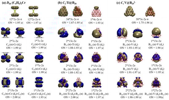AdNDP bonding patterns of (a) D6h Cr(C6H6)2, (b) C2 Ti@B28 (2), and (c) Cs V@B292− (4), with the occupation numbers (ON) indicated.