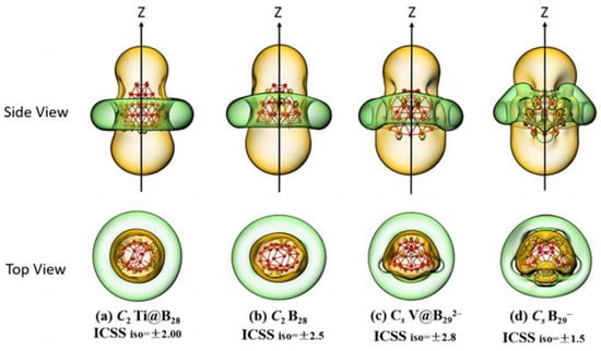 The calculated iso-chemical shielding surfaces (ICSSs) [] of Ti@B28 (2) and V@B292− (4) based on the ZZ components of the calculated nuclear-independent chemical shifts (NICS-ZZ) shown in Figure 3a,c appear to be similar with that of the experimentally known spherically aromatic C2 B28 (Figure 3b) [] and Cs B29− (Figure 3d) [], respectively, well supporting the spherical aromaticity of these endohedral seashell-like endohedral complexes. The spaces inside the boron cage or within 1 Å above the cage surface in vertical directions with negative NICS–ZZ values belong to chemical shielding regions (highlighted in yellow), while the belt-like region outside the cage in the horizontal direction around the waist belongs to the chemical de-shielding area (highlighted in green).
