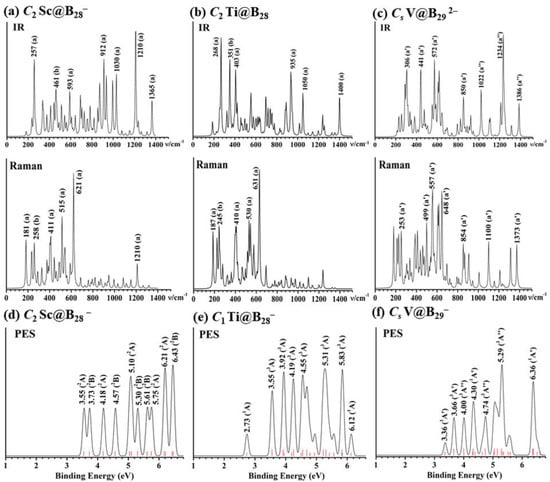 Simulated IR and Raman spectra of (a) C2 Sc@B28− (1), (b) C2 Ti@B28 (2), and (c) Cs V@B292− (4) and PE spectra of (d) C2 Sc@B28−, (e) C1 Ti@B28−, and (f) Cs V@B29− at PBE0/6-311+G(d) level. The red bars in (d), (e,f) stand for the positions of calculated PE features, with the long and short red bars in (e,f) representing triplet and singlet final states in the neutrals, respectively.