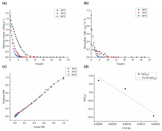 Drying kinetic curves of Moslae herba. (a) Moisture content (dry basis) curves of Moslae herba at temperatures of 40 °C, 50 °C and 60 °C. (b) Drying rate curves of Moslae herba at temperatures of 40, 50 and 60 °C. (c) Relationship between the predicted and measured values of the moisture ratio. (d) Curve of the relationship between lnDeff and 1/T.
