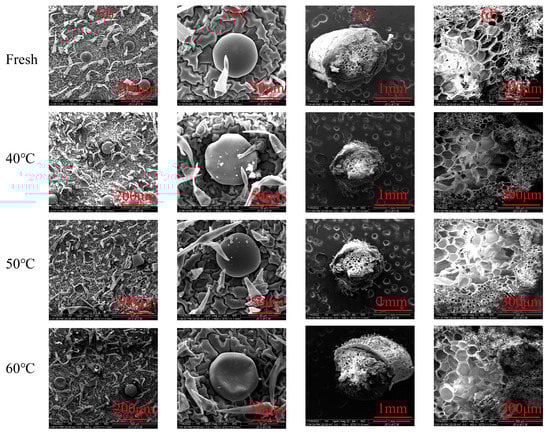 The microstructural images of fresh and dried Moslae herba samples. (a) Epidermal surface of the leaves under 400× magnification. (b) Epidermal surface of the leaves under 1600× magnification. (c) Cross-sectional view of the stems under 100× magnification. (d) Cross-sectional view of the stems under 400× magnification. Fresh, fresh Moslae herba; 40 °C, Moslae herba after hot air-drying at 40 °C; 50 °C, Moslae herba after hot air-drying at 50 °C; 60 °C, Moslae herba after hot air-drying at 60 °C.