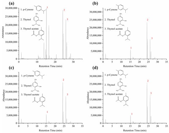 HS-GC-MS total ion flow diagram of the volatile components of Moslae herba at different drying temperatures. (a) Fresh Moslae herba, (b) Moslae herba after drying at 40 °C, (c) Moslae herba after drying at 50 °C and (d) Moslae herba after drying at 60 °C.