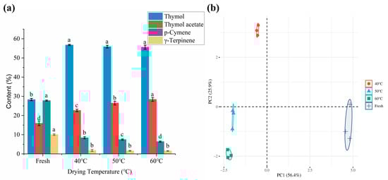 (a) The contents of four common components in Moslae herba at different temperatures. (b) PCA of the HS-GC-MS of Moslae herba volatile components under different drying temperatures. Bars with different letters represent significant difference (p < 0.05).
