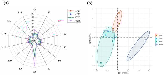 The electronic nose technology (E-nose) has been widely known to be sensitive to the aroma of various products. Since it is able to detect slight changes in volatile compounds, which might be responsible for the different responses of the sensor. Moreover, it is an excellent method for analyzing aromas and has been widely used in the fields of biomedicine, environment, manufacturing, food, pharmaceuticals and other scientific research fields []. To assess the influence of various drying treatments on the aroma profile of Moslae herba, an E-nose equipped with 14 sensors was adopted in this study to analyze the combined aroma characteristics of Moslae herba. The sensitivity of the volatile component sensors to Moslae herba was approximately the same for the different drying temperatures, but the intensity of the response values varied. This is because the intensity of the response is determined by the variation in the content of volatile components. The radar fingerprint of the aroma distribution in Moslae herba is presented in Figure 5a, in which all Moslae herba samples presented relatively higher values in S1 (sensitive to aromatic compounds) and S8 (sensitive to amines), followed by S2 (sensitive to nitrogen oxides), S6 (sensitive to thionine) and S12 (sensitive to sulfides from environment). Whereas, sensors S3 (sensitive to sulfides from vegetables), S7 (sensitive to combustible gas) and S14 (sensitive to volatile gases from cooking) showed smaller response values. Meanwhile, it can be clearly observed that notable differences in the signal intensity of the sensors between the fresh samples and dried samples, indicating notable alterations in the composition of the volatile compounds during the heating process. Among them, the signal intensity of S1 (sensitive to aromatic compounds) and S8 (sensitive to amines) was significantly higher in fresh samples as compared with dried samples, and they decreased with a rising temperature, which may be due to the loss of aromatic compounds at higher temperatures. In a previous study, researchers used electronic nose technology to monitor the changes in odor of Flammulina velutipes during the hot air-drying process, which was similar to our results []. Therefore, it is feasible to use electronic nose technology to distinguish the variations in the odor of Moslae herba during the hot air-drying process.