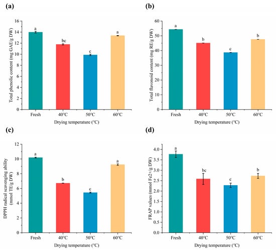 Effects of different drying temperatures on content of TPC (a), TFC (b), DPPH (c) and FRAP (d) in Moslae herba. Bars with different letters represent significant differences (p < 0.05).