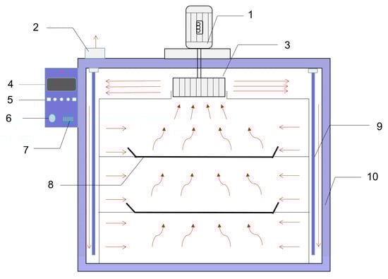 Schematic diagram of the hot air-drying system: 1, blower motor; 2, air outlet; 3, air inlet; 4, display; 5, operation buttons; 6, wind speed adjustment button; 7, switch; 8, tray; 9, heater; 10, insulation layer.