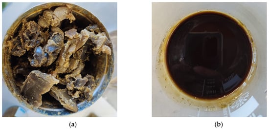 Vegetable “concretes” are semi-solid materials that have a waxy consistency and viscosity. Therefore, in order to optimize the contact between the material and SC-CO2 in the extraction vessel, sage “concrete” was melted and mixed with 3 mm glass beads. Figure 2 shows the comparison between raw and melted sage “concrete”. In the first case (Figure 2a), the “concrete” was solid, and its consistency could compromise the extraction process, due to a large mass transfer resistance and problems of channeling, whereas in the second case (Figure 2b), after careful mixing with proper packing materials, channeling and caking phenomena could be avoided. The choice of 3 mm glass beads was related to the “concrete” consistency and its exposed surface; smaller spheres could increase the exposed surface, but they would decrease the void degree available to the extraction fluid to pass through the vessel. Indeed, the Clary Sage “concrete” would pack inside the extraction vessel, and SC-CO2 could not penetrate inside the vegetable material; extraction would be ineffective and discontinuous, since material depletion would not happen homogenously. On the other hand, larger glass beads would produce smaller pressure drops, and would reduce the risk of channeling and caking, but they would decrease the “concrete” exposed surface and increase the shell thickness on the beads. Therefore, internal mass transfer phenomena could not be neglected, and extraction time would be much longer. Other packing materials (Berl saddles, Raschig rings, etc.) were discarded, since, due to their irregular surface, they did not assure a homogenous distribution of the material on it and in the vessel, compromising the extraction effectiveness. The result of the mixing between glass spheres and Clary Sage “concrete” was instead a system that could be approximated to an inert core (glass) surrounded by an active shell (“concrete”).
