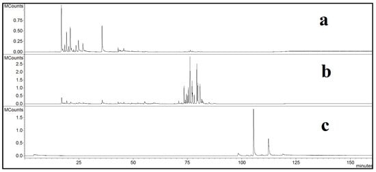 GC-MS traces of: (a) extract collected at 90 bar/50 °C; (b) extract collected at 100 bar/40 °C; (c) waxes.