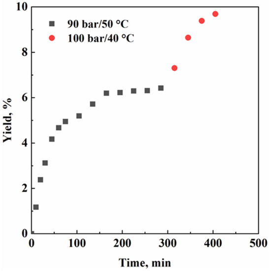 In the second part of this work, our attention was focused on the effect of the operating conditions on the extraction yield. As evidenced from Figure 5, CO2 density immediately affected the extraction yield; the higher the density, the higher the solvent power of the supercritical fluid. The final extraction yield value, after around 7 h of experiment, was equal to 9.3% w/w.