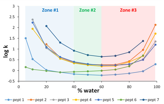 Log k vs. % water for 7 different peptides on the Waters BEH HILIC column at 30 °C and 0.5 mL/min. The mobile phase is composed of ACN and water in the presence of 10 mM ammonium acetate. Various isocratic experiments were performed with compositions of water ranging from 5 to 99%. The three different zones highlighted in the figure are described in Section 2.1.1.