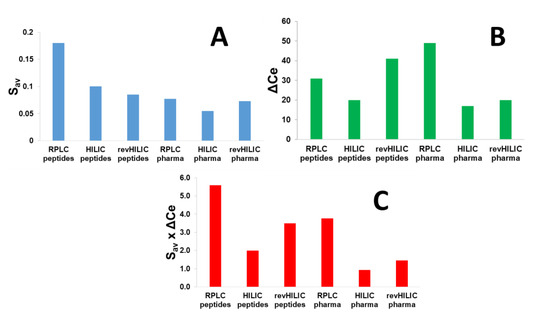 Saverage, ΔCe, and Saverage × ΔCe values (cf. Equation (1)) for six different chromatographic conditions, including RPLC, HILIC, and revHILIC applied to the separation of a wide range of peptides and small pharmaceutical compounds. (A) Saverage values for the different samples in RPLC and HILIC, (B) ΔCe values for the different samples in RPLC and HILIC, (C) Saverage × ΔCe values for the different samples in RPLC and HILIC.