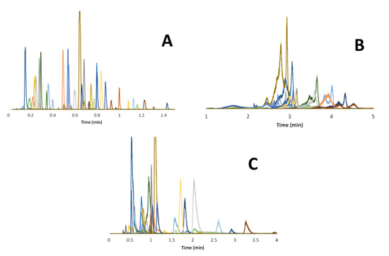Overlay of numerous representative EICs of peptides in the three different modes. (A) RPLC analysis with a 1–99% B gradient in 4 min (bav = 0.25); mobile phase composed of water with 0.1% FA as solvent A and ACN with 0.1% FA as solvent B. (B) HILIC analysis with a 2–42% A gradient in 4 min (bav = 0.24). (C) revHILIC analysis with a 1–51% B gradient in 4.8 min (bav = 0.21); mobile phase composed of water with 10 mM AA as solvent A and acetonitrile as solvent B. A given color corresponds to a given EIC.