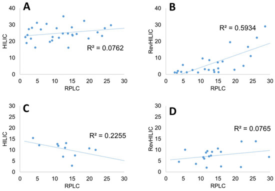 A wide variety of orthogonality metrics (quantitative measures of the efficacy of separation space utilization) have been proposed in the context of two-dimensional chromatography [53]. In the present case, we have considered one of the simplest and most direct approaches, which consists of plotting the elution composition of the different compounds (peptides or small drugs) in one chromatographic mode against another one and measuring the corresponding correlation coefficient. This approach can be considered as acceptable for systems without data clustering and data outliers, which is our case, as shown in Figure 5 [54].